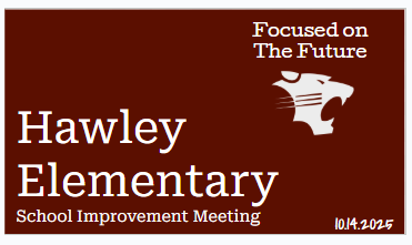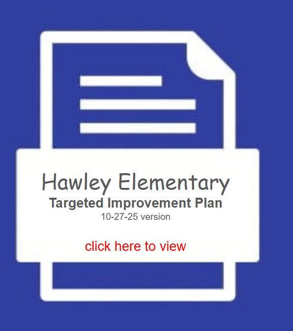 Please join us at the October School board Meeting on Monday October 27, 2025 at 5:00pm in the administration building to review the Targeted Improvement Plan that has been created for Hawley Elementary School.
